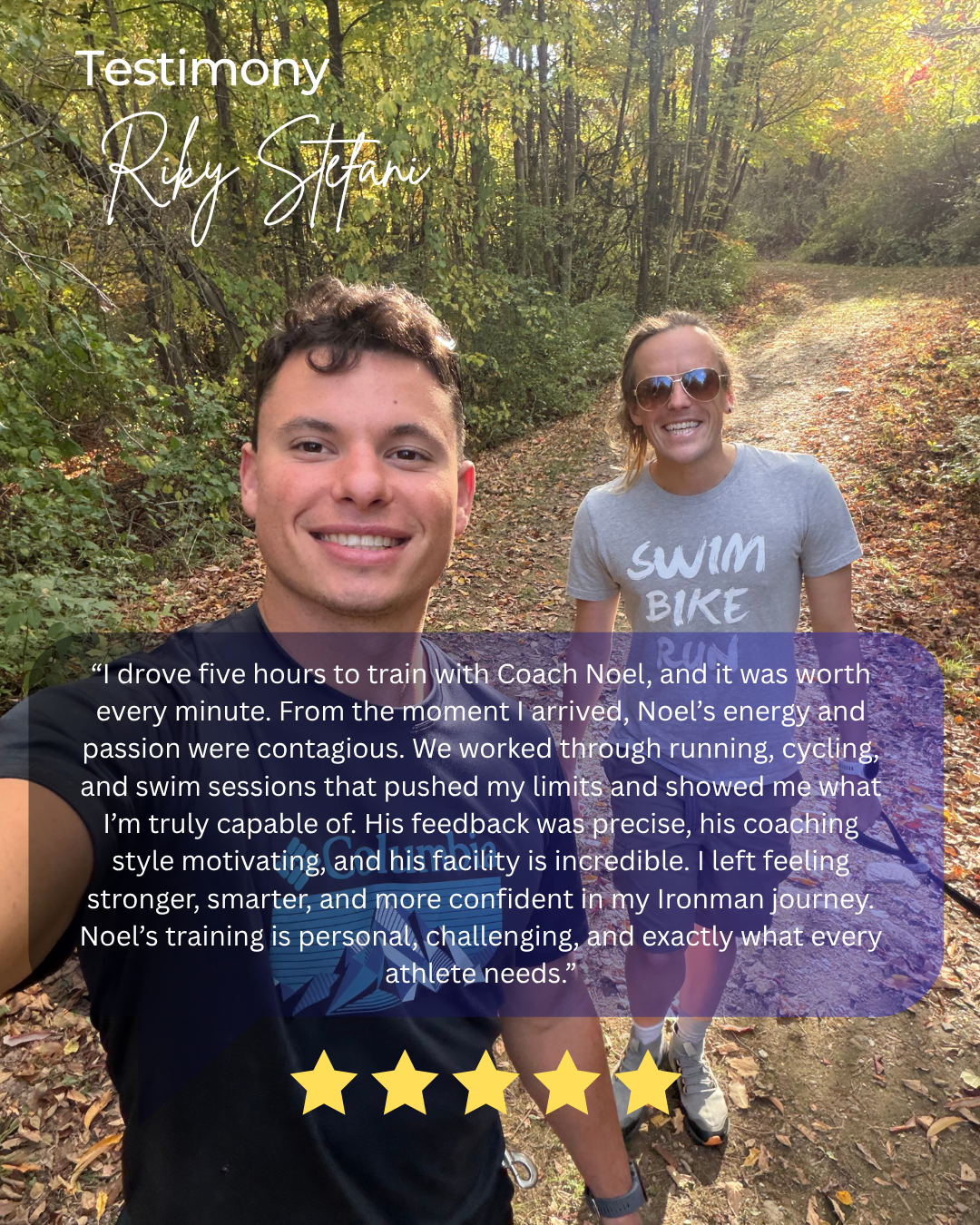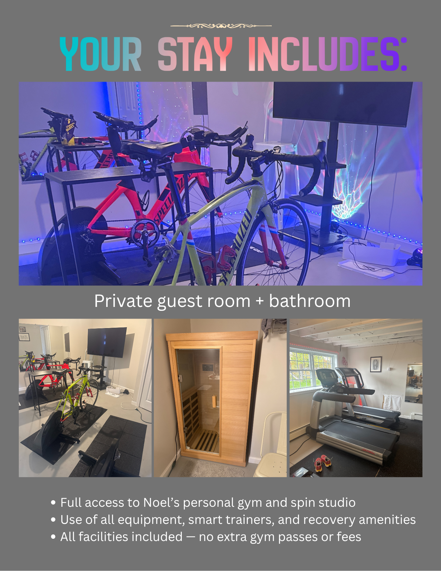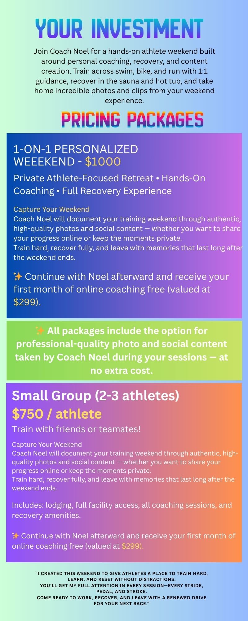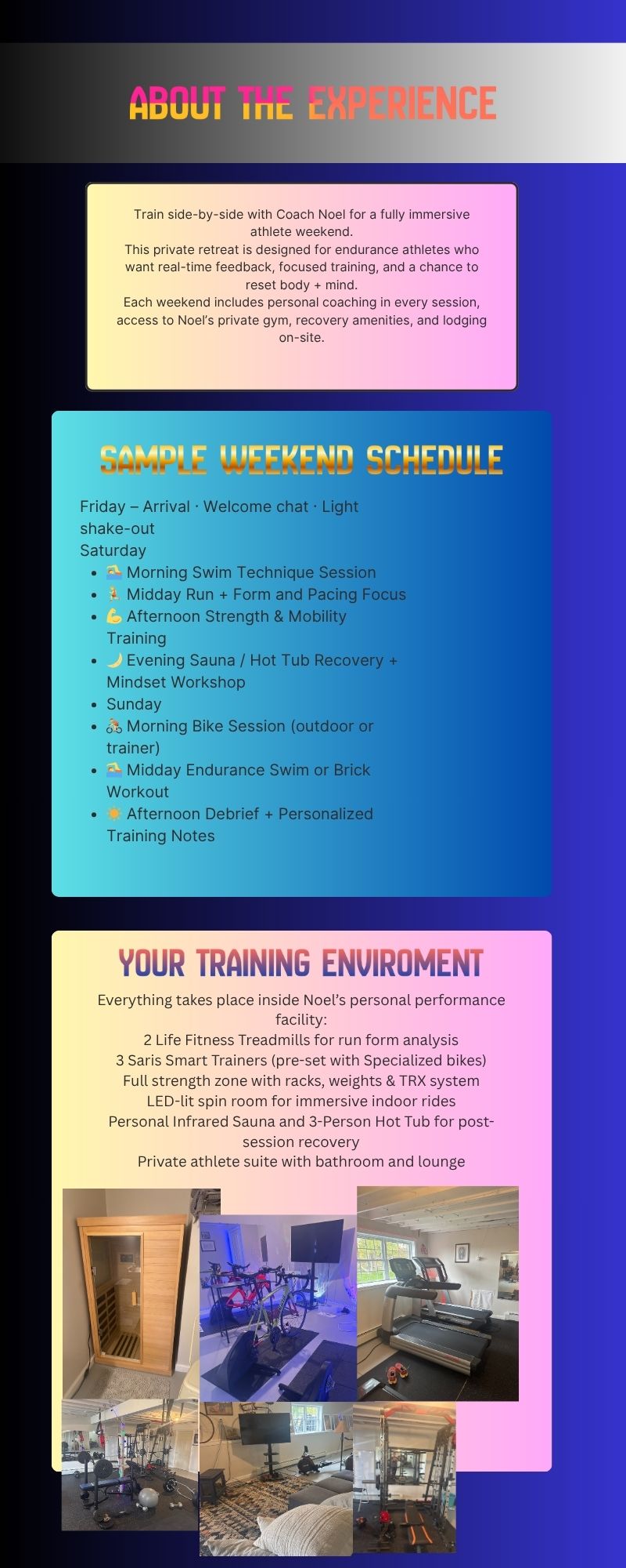 Coach Noel Says...“This weekend is built for athletes who want real coaching — not just training sessions. You’ll train in my gym, get detailed feedback, and recover the way I do during race prep. Every workout, every sauna session, every detail is designed to help you reset, refocus, and reignite your drive.”